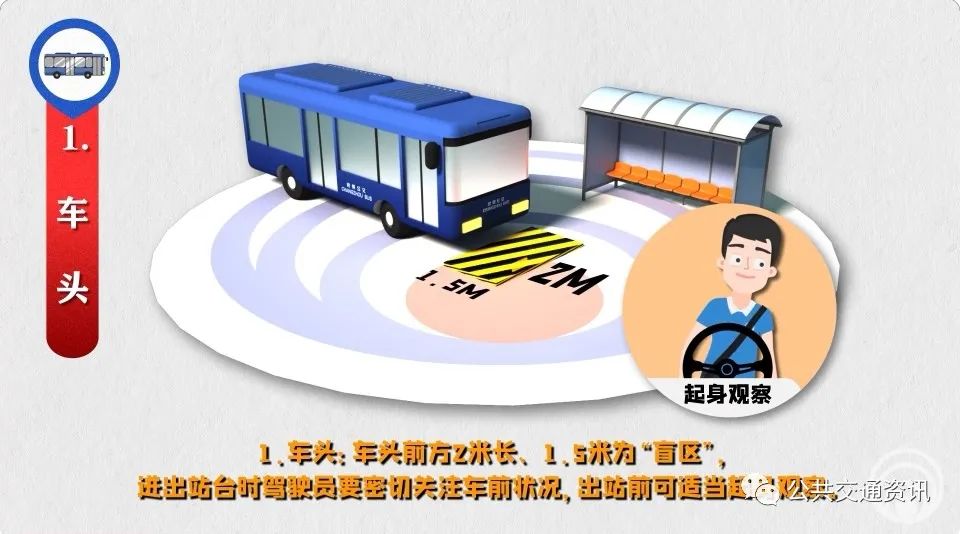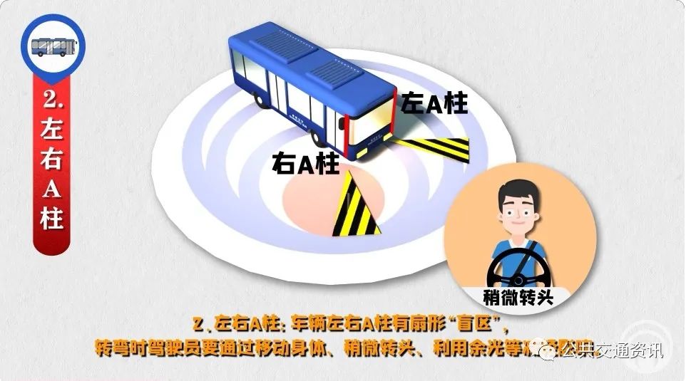“盲區(qū)”是由于視線受到遮擋,駕駛員無(wú)法直接看到的車輛外部的區(qū)域。公交駕駛員運(yùn)營(yíng)時(shí)要防范各類“盲區(qū)”風(fēng)險(xiǎn)。