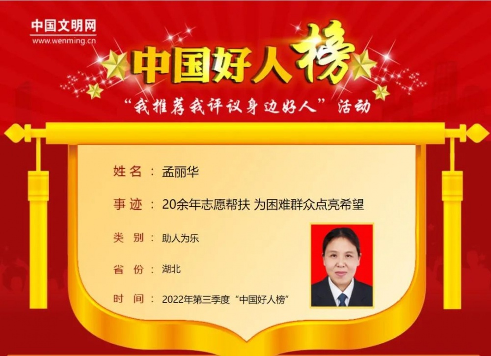 孟麗華,女,漢族,1970年生,中共黨員,荊門市公共交通集團(tuán)有限公司點(diǎn)鈔中心副主任、荊門市圓夢愛心幫扶會會長。二十多年來,孟麗華通過捐資助學(xué)、扶老助殘、幫扶貧困,將幾十多萬元工資獎金和全部工余時間都用來做志愿服務(wù),把助人當(dāng)做自己的快樂和幸福,向社會傳遞著溫暖和關(guān)愛。先后獲得全國三八紅旗手、全國孝親敬老之星、湖北省五一勞動獎?wù)?、荊楚楷模、湖北省十大愛心助殘人士、崗位學(xué)雷鋒標(biāo)兵等榮譽(yù)稱號。