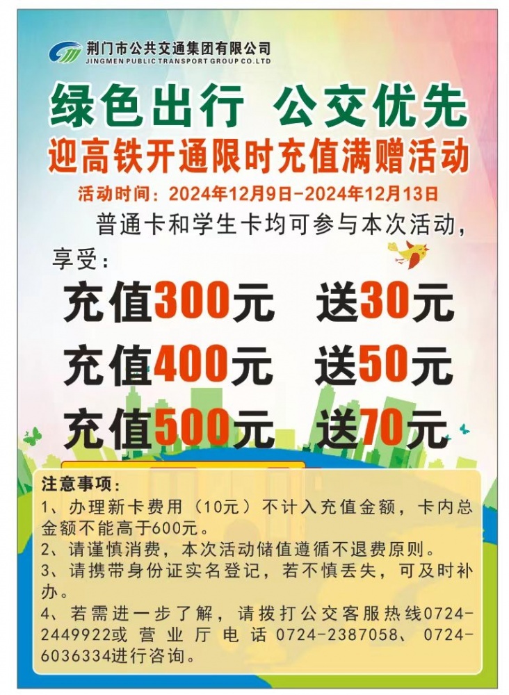 為迎接高鐵開通,荊門公交限時儲值活動開啟,具體如下: