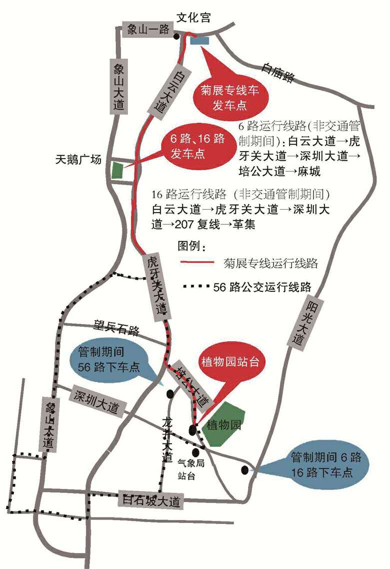 值得說明的是,菊展期間,公交按現(xiàn)行票價收費。菊展前三天,深圳大道東端、培公大道(培公大道與龍井大道交叉路口至培公大道與白石坡大道交叉路口)將實現(xiàn)交通管制,禁止公交車通行,這樣一來,上述四條公交在植物園附近的線路和停靠站點將同步調(diào)整,菊展專線公交車將停靠在培公大道植物園出口,其他時間??吭谥参飯@大門附近的植物園站臺。交通管制期間,16路公交車、6路公交車將停靠在白石坡大道東上下車。56路交通管制期間線路不延伸,在培公大道與龍井大道交叉路口上龍井大道,游客可在龍井大道北段上下。荊門晚報訊(記者戴永君)