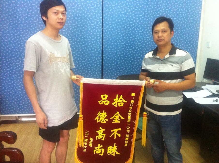 原來,15日下午2時許,1路公交車司機吳騰驅(qū)車途經(jīng)城區(qū)長寧大道長寧8號廣場(中百倉儲)公交站點時,在馬路中央撿到一個黑色皮包,并及時上交到公交集團公汽一公司。公司負(fù)責(zé)人將皮包內(nèi)身份證信息通過《荊門晚報》及荊門社區(qū)網(wǎng)絡(luò)媒體發(fā)布尋找失主陳先生信息,陳先生看到招領(lǐng)信息后,很快得知錢包的下落了,他說這(找回錢包)是他萬萬沒想到的。18日上午,陳先生順利地從公汽一公司負(fù)責(zé)人手中認(rèn)領(lǐng)到丟失的錢包,并特意為吳師傅制作了一面"拾金不昧 品德高尚"錦旗表示謝意。