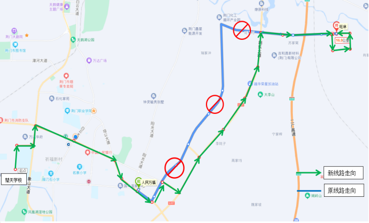 一.優(yōu)化調(diào)整33路公交線路走向 ◆首末站:楚天學(xué)校—旺林(小康南路北) ◆首末班時(shí)間:6:50—17:45 ◆線路走向:響嶺路—運(yùn)動(dòng)公園路—象山大道—深圳大道—培公大道—荊和大道—深圳大道—荊東大道—興化三路—格林北路—興化四路—小康南路 ◆??空军c(diǎn):楚天學(xué)校、雙喜街辦、運(yùn)動(dòng)公園路、萬(wàn)達(dá)廣場(chǎng)、掇刀檢察院、掇刀法院、掇刀公安分局、南城明珠、中國(guó)人民銀行、市氣象局、襄荊高速、雙泉社區(qū)、人民萬(wàn)福商貿(mào)城、人民一品花園、虎頭山、殯儀館、馮廟村、固潤(rùn)科技、東方雨虹、圣通石化、荊東消防、荊東大道興化五路口、潤(rùn)都制藥、興化三路西、興化三路中、興化三路盈德氣體、紐蘇萊、旺林、興化四路、小康南路北。 ◆取消原33路途經(jīng)荊和大道等路段站點(diǎn):荊和大道南、陽(yáng)光五路、陽(yáng)光四路、陽(yáng)光三路、化工產(chǎn)業(yè)園行政大樓。 二.優(yōu)化調(diào)整69路公交發(fā)班時(shí)間 ◆調(diào)整前 園博園東門發(fā)班時(shí)間:6:40、7:40、15:30、16:30、17:15 玲瓏輪胎發(fā)班時(shí)間:7:30、8:30、16:30、17:30、18:00 ◆調(diào)整后 園博園東門發(fā)班時(shí)間:6:40、7:20、15:30、16:30 玲瓏輪胎發(fā)班時(shí)間:7:30、8:20、12:20、16:20、17:30